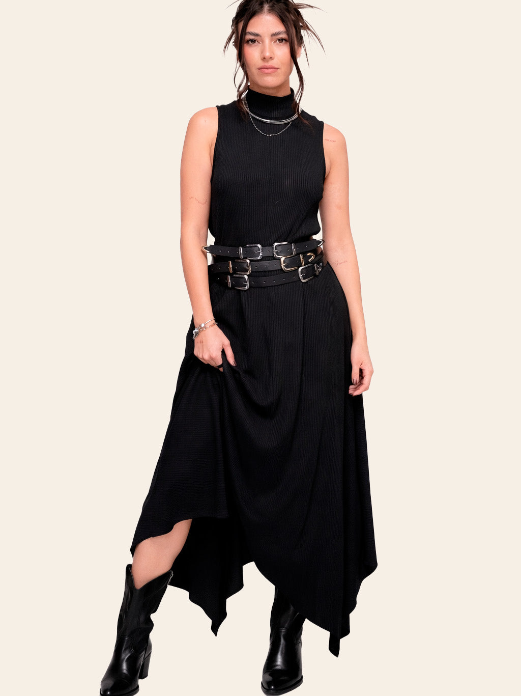This striking black asymmetric dress, crafted from a refined cotton-polyester blend for comfort and durability. The high neckline and square-cut hem create a contemporary silhouette that exudes understated elegance. Perfect for both professional settings and sophisticated evening occasions, this versatile piece transitions seamlessly from day to night. The balanced fabric composition ensures a flattering drape while maintaining its shape, making it an essential addition to any discerning woman's collection.
